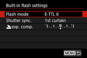 Iebūvētās zibspuldzes vai ārējās EL/EX sērijas Speedlite funkcijas var iestatīt no kameras izvēlnes ekrāniem.