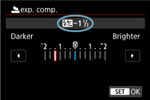 - Lai padarītu zibspuldzes ekspozīciju gaišāku, iestatiet kompensācijas apjomu.virzienā uz [Brighter/Gaišāk] (pozitīva kompensācija), vai, lai padarītu to tumšāku, iestatiet to virzienā uz [Darker/Tumšāk] (negatīva kompensācija).