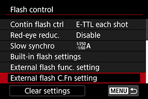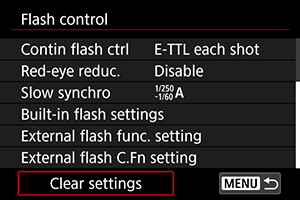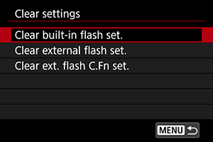 - Izvēlieties [Clear built-in flash set./Dzēst iebūvētās zibspuldzes iestatījumus], [Clear external flash set./Dzēst ārējās zibspuldzes iestatījumus] vai [Clear ext. flash C.Fn set./Dzēst ārējās zibspuldzes pielāgoto funkciju iestatījumus].