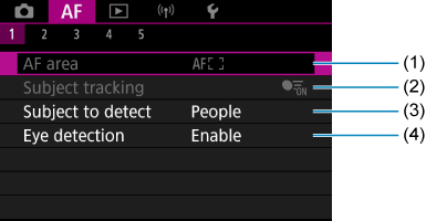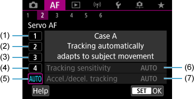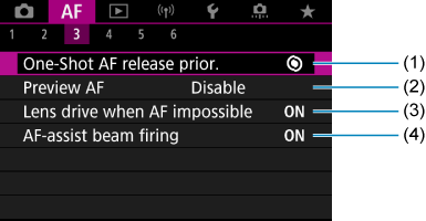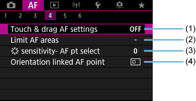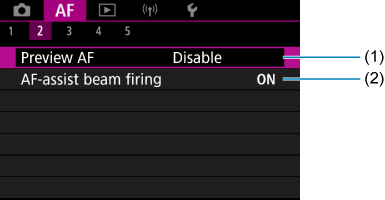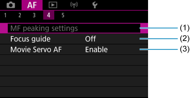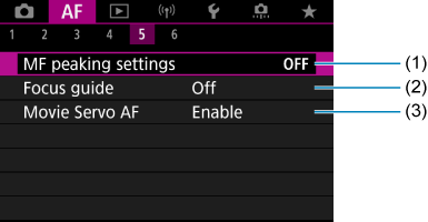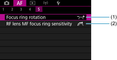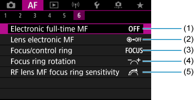 - (5) RF lens MF focus ring sensitivity/RF objektīva MF fokusēšanas gredzena jutība