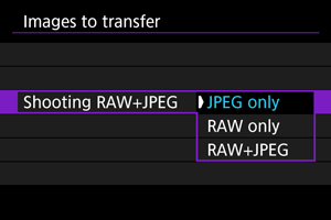 - Izvēlieties [RAW+JPEG transfer/RAW+JPEG sūtīšana], pēc tam izvēlieties [JPEG only/Tikai JPEG], [RAW only/Tikai RAW] vai [RAW+JPEG].