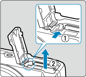 Atbīdiet kartes/akumulatora nodalījuma vāciņa slēgu un atveriet vāciņu.