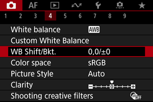 , tiek atcelti visi [WB Shift/Bkt. / Baltā balansa pārbīde/Vairākkadru dublēšana] iestatījumi.