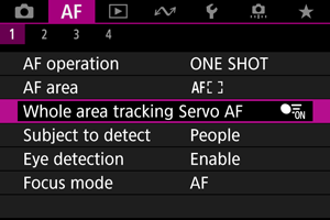 Var iestatīt pārslēgšanos uz sekošanu objektam visā laukumā Servo AF laikā (kad aizslēga poga ir nospiesta līdz pusei un [: AF operation/