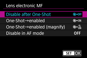 Objektīviem, kuri aprīkoti ar elektronisko manuālo fokusēšanu, var norādīt, kā fokusa manuālā regulēšana tiks lietota ar viena kadra AF.