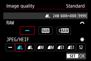 - Ja izvēlaties gan RAW, gan JPEG/HEIF, divas katra kadra versijas tiek ierakstītas norādītajā attēla kvalitātē. Abiem attēliem ir viens faila numurs, taču tiem ir atšķirīgi faila paplašinājumi — .JPG ir JPEG failiem, .HIF ir HEIF failiem un .CR3 ir RAW failiem.