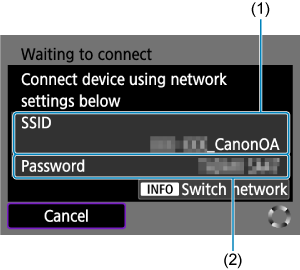 - Pārbaudiet kameras ekrānā attēloto SSID ID (1) un paroli (2).