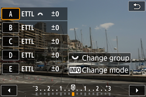 Skatot uzņemšanas ekrānu bezvadu vairāku zibspuldžu fotogrāfijā, varat konfigurēt katras zibspuldžu grupas iestatījumus, ekrānā [: Customize buttons/