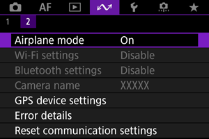 Ja nevēlaties saglabāt Wi-Fi vai Bluetooth savienojumu ar kameru, kad tā ir izslēgta, vai nu iestatiet [: Airplane mode/