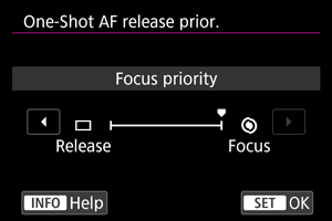 Varat norādīt, vai viena kadra AF palaišanai piešķirt fokusēšanas prioritāti vai palaišanas laika prioritāti (izņēmums: uzņemšana ar skārienaizslēgu).