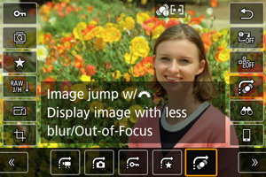 - Atskaņojot attēlus, kas uzņemti RAW+JPEG vai RAW+HEIF formātā, netiek rādītas ikonas vai noteikšanas rāmji, kas norāda uz izplūšanas pakāpi, jo šai atskaņošanai tiek izmantoti RAW attēli. Lai pārbaudītu ikonas vai noteikšanas rāmjus, kas norāda izplūšanas apjomu, ja [