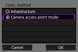 Izvēlieties [Camera access point mode/Kameras piekļuves punkta režīms].