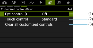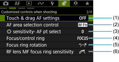- (1) Touch & drag AF settings (Skāriena un pārvilkšanas AF iestatījumi)