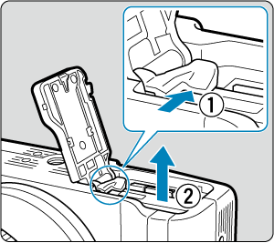 Atbīdiet kartes/akumulatora nodalījuma vāciņa slēgu un atveriet vāciņu.