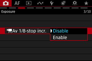 Izvēlieties [: Av 1/8-stop incr./: Av solis 1/8] ().