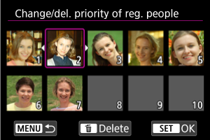 Varat mainīt noteikšanas prioritāti, pārkārtojot reģistrētās personas. Varat arī dzēst reģistrētās personas.