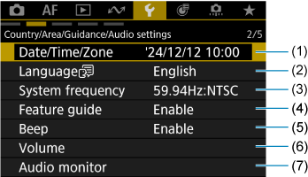 Country/Area/Guidance/Audio settings (Valsts/Apgabals/Brīdinājumi/Audio iestatījumi)