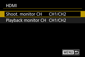 Izvēlieties [Shoot. monitor CH/Uzņemšanas pārr. kanāls] vai [Playback monitor CH/Demonstrēšanas pārr. kanāls].