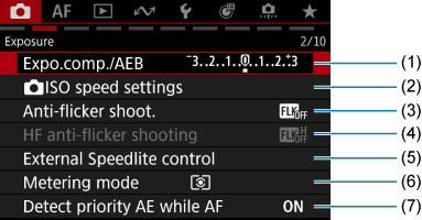 - (1) Expo.comp./AEB (Ekspozīcijas kompensācija/AEB)