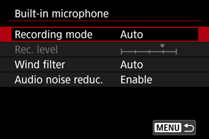 Skaņas ierakstīšanas līmeni var regulēt pēc vajadzības. Pielāgojiet līmeni [Rec. level/Ierakstīšanas līmenis].