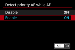 - [Enable/Iespējot]: Mērīšana tiek veikta, pamatojoties uz AF punktu vai AF laukumu, kurā objekts tika noteikts.