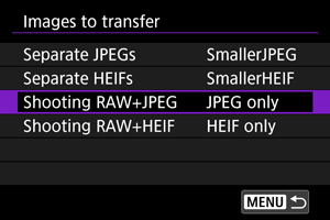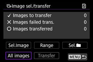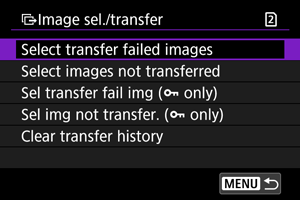 - Pēc sūtīšanas vēstures dzēšanas var izvēlēties [Select images not transferred/Nesūtīto attēlu atlase] un no jauna sūtīt visus attēlus mapē.