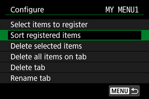 “Manā izvēlnē” var mainīt reģistrēto vienumu secību. Izvēlieties [Sort registered items/Kārtot reģistrētos vienumus], izvēlieties pārvietojamo vienumu, pēc tam nospiediet