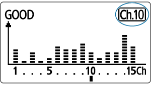 U kunt de radiosignaalomstandigheden scannen en vervolgens het zendertransmissiekanaal automatisch of handmatig instellen. Als u het kanaal instelt op [AUTO], wordt de Speedlite automatisch ingesteld op het kanaal met het sterkste signaal. Als u het kanaal handmatig instelt, kunt u de scanresultaten beoordelen terwijl u hem instelt.