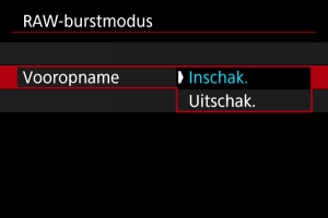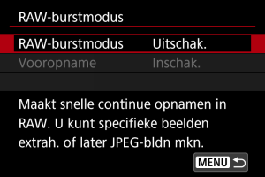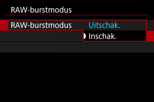 : RAW-burstmodus] wordt teruggezet naar [Uitschak.] als u de aan-/uitschakelaar instelt op