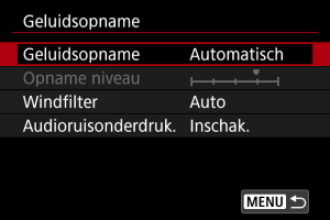 : Geluidsopname] [Aan] on [Uitschak.]. Stel [Aan] in voor automatische aanpassing van het opnameniveau.