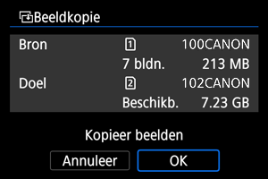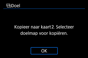 Als de doelmap of -kaart al een beeld bevat met hetzelfde bestandsnummer, worden [Sla beeld over en ga door], [Vervang bestaand beeld] en [Annuleer kopie] weergegeven. Selecteer een kopieermethode en druk vervolgens op de knop