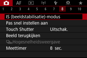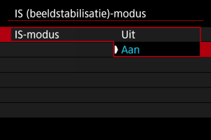 Beeldstabilisatie door de lens vermindert cameratrilling bij het maken van foto's. Om lens-IS te activeren bij het gebruik van IS-lenzen zonder IS-schakelaar stelt u [IS-modus] in op [Aan]. Doe dit als volgt: Merk op dat de instelling [IS-modus] niet wordt weergegeven als u IS-lenzen gebruikt die een IS-schakelaar hebben. In dat geval combineert het instellen van de IS-schakelaar van de lens op stabilisatie door de lens.