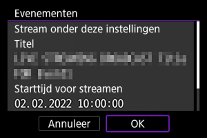 U kunt ook streamen door met de camera een evenement te selecteren dat u vooraf op de YouTube-site hebt geconfigureerd (door de streamingtijd en -titel in te voeren).