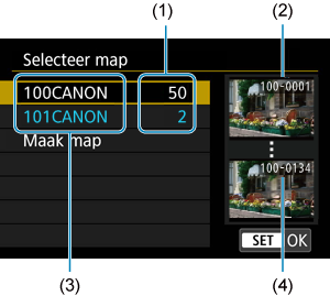 - Mappen krijgen een naam als “100CANON”, met een driecijferig mapnummer gevolgd door vijf letters of cijfers. Een map kan maximaal 9999 beelden bevatten (bestandsnummers 0001-9999). Wanneer een map vol raakt, wordt er automatisch een nieuwe map gemaakt met een mapnummer dat één cijfer hoger is. Ook wanneer de bestandsnummering handmatig opnieuw is ingesteld (), wordt er automatisch een nieuwe map gemaakt. Er kunnen mappen worden gemaakt met de nummers 100 t/m 999.