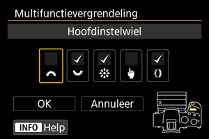 te drukken. Druk opnieuw op de knop om het Hulp-scherm te sluiten. Draai aan het instelwiel