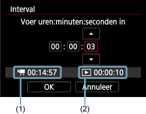 Geeft de video-opnametijd (tijd die vereist is om de video af te spelen) aan bij het maken van de time-lapse 4K-video of Full HD-video op basis van foto's die zijn gemaakt met de ingestelde intervallen.