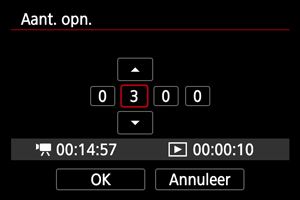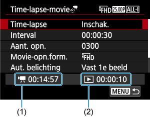- Zelfs wanneer de afspeeltijd van de time-lapse-video minder is dan 1 seconde, wordt nog steeds een videobestand gemaakt. In dit geval wordt “00'00"” aangegeven in [Afspeeltijd].