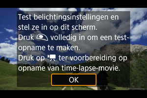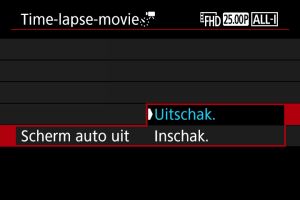 - De volgende handelingen annuleren stand-by voor time-lapse-video-opnamen en wisselen de instelling naar [Uitschak.].