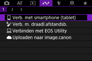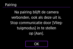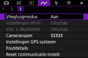 Als u de verbinding met de camera via Wi-Fi of Bluetooth niet wilt behouden wanneer deze is uitgeschakeld, stelt u [: Vliegtuigmodus] in op [Aan] of stelt u [