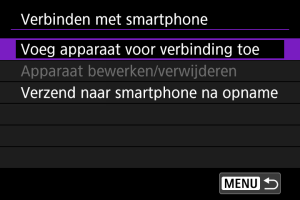 Schakel Bluetooth en Wi-Fi in vanaf het instellingenscherm van de smartphone. Houd er rekening mee dat koppelen met de camera niet mogelijk is vanaf het Bluetooth-instellingenscherm van de smartphone.