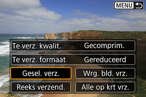 Alle beelden die aan de zoekcriteria voldoen zoals ingesteld in [: Beeldzoekvoork. instellen] tegelijk verzenden. Zie Zoekcriteria voor beelden instellen voor meer informatie over [