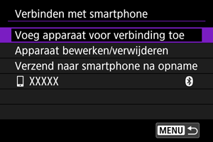 - De camera kan niet via Bluetooth met twee of meer apparaten tegelijkertijd worden verbonden. Zie Opnieuw verbinden via Wi-Fi/Bluetooth als u een andere smartphone wilt gebruiken voor de Bluetooth-verbinding.