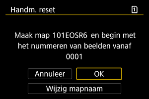 Wanneer u de bestandsnummering handmatig opnieuw instelt, wordt er automatisch een nieuwe map gemaakt en begint de nummering van de beelden die in die map worden opgeslagen bij 0001.