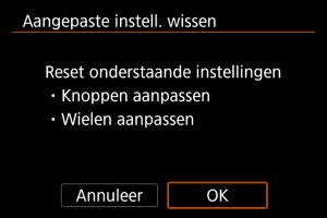 Door [: Wis pers. voorkeuze(C.Fn)] te selecteren wist u alle persoonlijke voorkeuze-instellingen behalve [Knoppen aanpassen] en [Wielen aanpassen].