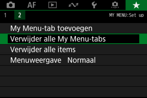 U kunt alle My Menu-tabbladen die u hebt gemaakt, verwijderen. Wanneer u [Verwijder alle My Menu-tabs] selecteert, worden alle tabbladen van [MY MENU1] tot en met [MY MENU5] verwijderd en wordt het tabblad [] teruggesteld op de standaardinstelling.