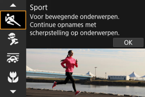 Gebruik de modus [] (Sport) om bewegende onderwerpen op te nemen, zoals hardlopers of rijdende auto's.