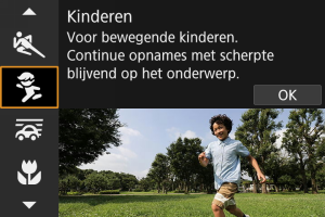 Gebruik de modus [] (Kinderen) om actieve kinderen op te nemen die rondrennen. Dit zorgt ook voor een gezonde huidtint in de opnamen.