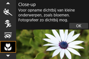 Gebruik de modus [] (Close-up) voor close-ups of kleine onderwerpen, zoals bloemen. Gebruik een macrolens (afzonderlijk verkrijgbaar) om kleine onderwerpen veel groter te laten uitkomen.