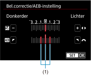 - AEB wordt niet automatisch geannuleerd. Om AEB te annuleren volgt u stap 2 om de weergave van het AEB-bereik uit te schakelen.