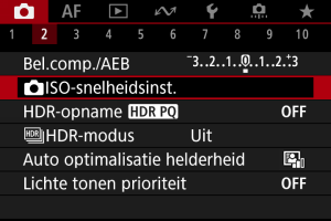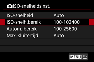 - Om het bereik van de handmatige ISO-snelheidsinstelling uit te breiden van L (equivalent met ISO 50) naar H (equivalent met ISO 204800), moet u [ISO-snelh.bereik] aanpassen in [